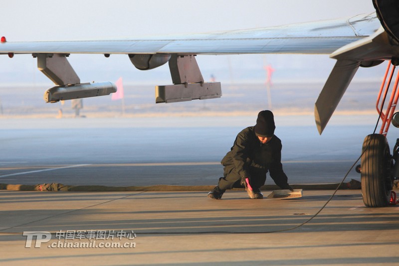 2013年1月6日,空軍華北機場某航空兵師在這一天新年首飛。在進行了兩天的充分準備之后,機務人員在早晨6點30分就準時來到外場。上午9點整,數架殲十戰機準時升空,開始了一天的訓練。記者在外場有幸記錄下這冬日陽光里精彩的飛行場景。(來源:中國軍網 苑小偉攝影報道)