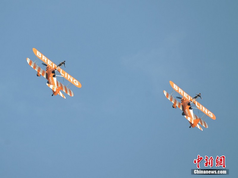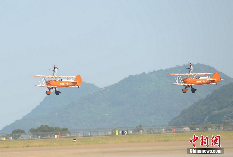 11月11日下午,歐洲“百年靈”機翼行走飛行表演隊表演了精彩的“云中漫步”。兩架飛機上各站有一名美女,在空中表演獨門舞步和雜技,隨飛機一起“云中漫步”,優雅精準。