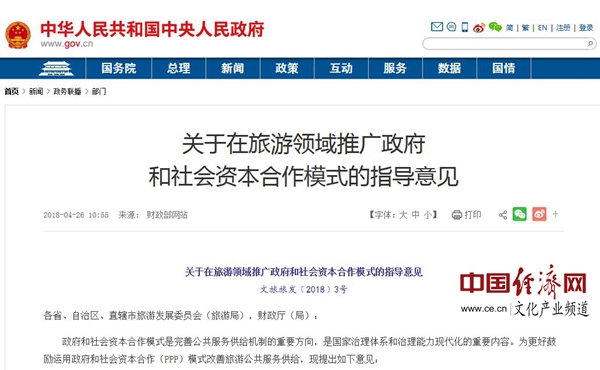 經濟日報-中國經濟網北京5月7日訊 近日,文化和旅游部、財政部日前聯合印發了《關于在旅游領域推廣政府和社會資本合作模式的指導意見》,就調動更多社會資源參與旅游業發展,探索推廣旅游PPP實施路徑、發展模式及長效機制,提高旅游投資有效性和公共資源使用效益,建設一批旅游PPP示范項目作出全面部署。以下為意見全文: