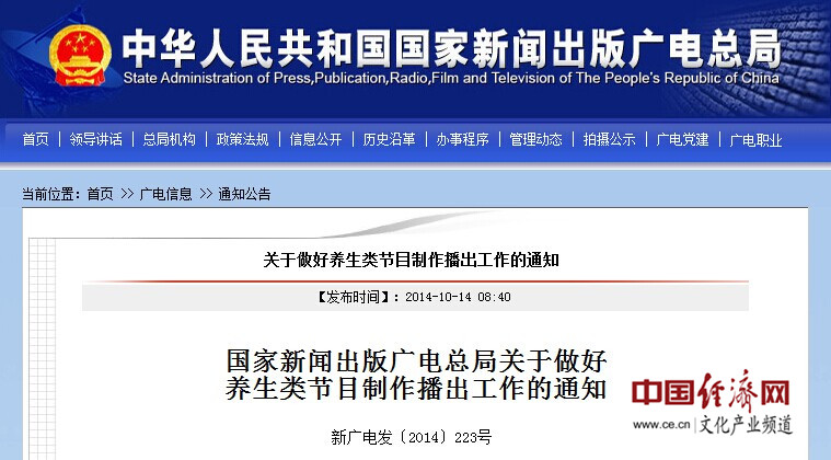 中國經濟網北京10月22日訊 中國經濟網文化產業頻道記者從國家新聞出版廣電總局網站獲悉,近日,國家新聞出版廣電總局針對養生類節目存在夸張宣傳、廣告植入等問題下發通知,規范養生類節目播出秩序。通知要求,電視養生類節目只能由電視臺策劃制作,不得由社會公司制作,并嚴禁以變相形式發布廣告等。以下為通知全文。
