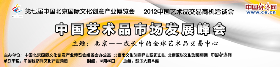 目前,北京藝術品市場在全球格局中將處于怎樣的定位?藝術品的稅收問題如何解決?中國藝術品經營及研究機構面臨哪些機遇和挑戰?文化保稅區的政策優勢如何能促進北京藝術品交易市場的發展?作為2012第七屆中國北京國際文化創意產業博覽會重要的活動之一,由北京文化創意產業促進中心、北京歌華文化發展集團和中國經濟網共同主辦,中國經濟網文化產業頻道承辦的“2012中國藝術品市場發展峰會”將于12月在北京舉行,特邀請政府相關部門及各方人士針對目前北京藝術品市場發展現狀和發展趨勢進行直接的交流對話。