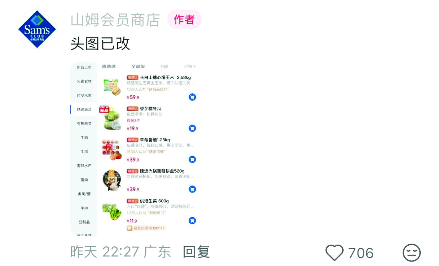 “本次APP的改動于今年8月底開始上線進(jìn)行測試,并在期間持續(xù)根據(jù)會員的反饋進(jìn)行優(yōu)化。這兩天我們陸續(xù)收到了更多來自會員關(guān)于商品圖片等方面的寶貴建議,我們將會持續(xù)改進(jìn),以更好地展現(xiàn)商品的真實形態(tài)并提升體驗。我們始終珍視會員的聲音,歡迎大家在‘山姆APP—我的—用戶調(diào)研—商品詳情頁調(diào)研’持續(xù)給予反饋。感謝大家的支持。”除此之外,山姆還在評論區(qū)配圖稱:“頭圖已改。”