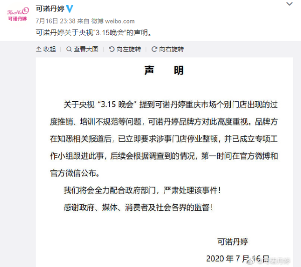 昨日晚間,可諾丹婷針對 315 晚會報道作出回應。可諾丹婷表示,關于央視“3.15晚會”提到可諾丹婷重慶市場個別門店出現的過度推銷、培訓不規范等問題,可諾丹婷品牌方對此高度重視。品牌方在知悉相關報道后,已立即要求涉事門店停業整頓,并已成立專項工作小組跟進此事,后續會根據調查到的情況,第一時間在官方微博和官方微信公布。