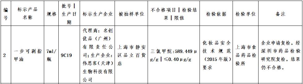經濟日報-中國經濟網9月25日訊(記者 韓璐) 上海市藥品監督管理局23日發布的抽檢公告顯示,由名創優品(廣州)有限責任公司代理的指甲油添加禁用物質三氯甲烷,并且經企業申請復檢后結果仍不合格。 檢驗結果顯示,該產品中三氯甲烷的含量高達589.449μg/g,相比《化妝品安全技術規范》(2015年版)中規定的檢測限值超標1400多倍。
