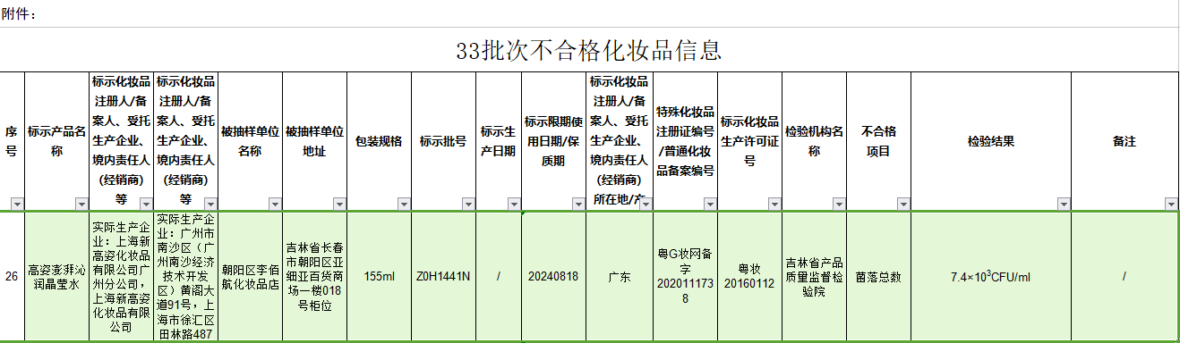 通告顯示,經吉林省產品質量監督檢驗院檢驗,實際生產企業為上海新高姿化妝品有限公司廣州分公司,上海新高姿化妝品有限公司生產的高姿澎湃沁潤晶瑩水產品不合格,不合格項目為菌落總數超標。按照《化妝品安全技術規范》規定,一般化妝品的菌落總數限值為≤1000,而此次不合格產品被檢出7.4×1000FU/ml,也就是限值的7.4倍。