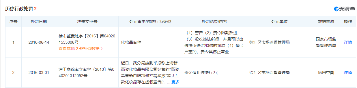 據天眼查,上海新高姿化妝品有限公司曾有兩次歷史行政處罰記錄,一次因添加了未經審批的配方被警告,并沒收違法所得;一次因虛假宣傳,違反了《中華人民共和國反不正當競爭法》《上海市反不正當競爭條例》等相關法律被責令停止違法行為。