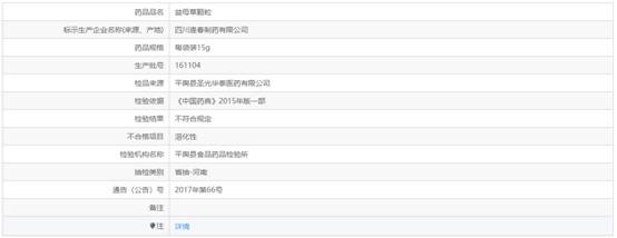 事實(shí)上,這并非四川逢春制藥有限公司首次出現(xiàn)藥品質(zhì)量缺陷。中國(guó)經(jīng)濟(jì)網(wǎng)記者查詢發(fā)現(xiàn),此前該公司生產(chǎn)的益母草顆粒就曾被通報(bào)不合格。