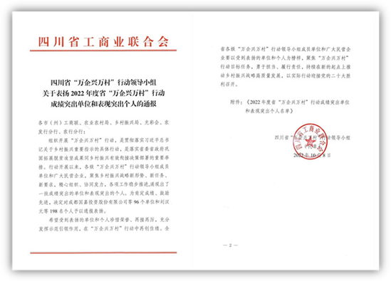 會上,表彰了2022年度“萬企興萬村”行動成績突出單位和表現突出個人。其中,全國人大代表、成都涼山商會會長、好醫生集團董事長耿福能受到四川省“萬企興萬村”行動領導小組通報表揚,獲評2022年度四川省“萬企興萬村”行動表現突出個人榮譽稱號。成都涼山商會常務副秘書長、好醫生集團鄉村振興工作組常務副組長謝芳福同獲表彰。