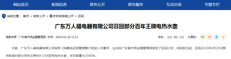 日前,廣東萬人福電器有限公司按照《消費品召回管理暫行規定》的要求,主動向廣東省市場監督管理局報告了召回計劃,將自即日起,召回2022年4月26日期間制造的部分百年王牌WA-15A型號電熱水壺,涉及數量為1560臺。