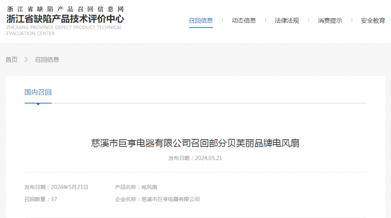 日前,慈溪市巨亨電器有限公司按照《消費(fèi)品召回管理暫行規(guī)定》的要求,主動(dòng)向浙江省市場(chǎng)監(jiān)督管理局和寧波市市場(chǎng)監(jiān)督管理局報(bào)告了召回計(jì)劃,將自即日起,召回2023年5月15日至2023年6月10日期間制造的部分貝芙麗牌B280型號(hào)電風(fēng)扇,涉及數(shù)量為37臺(tái)。