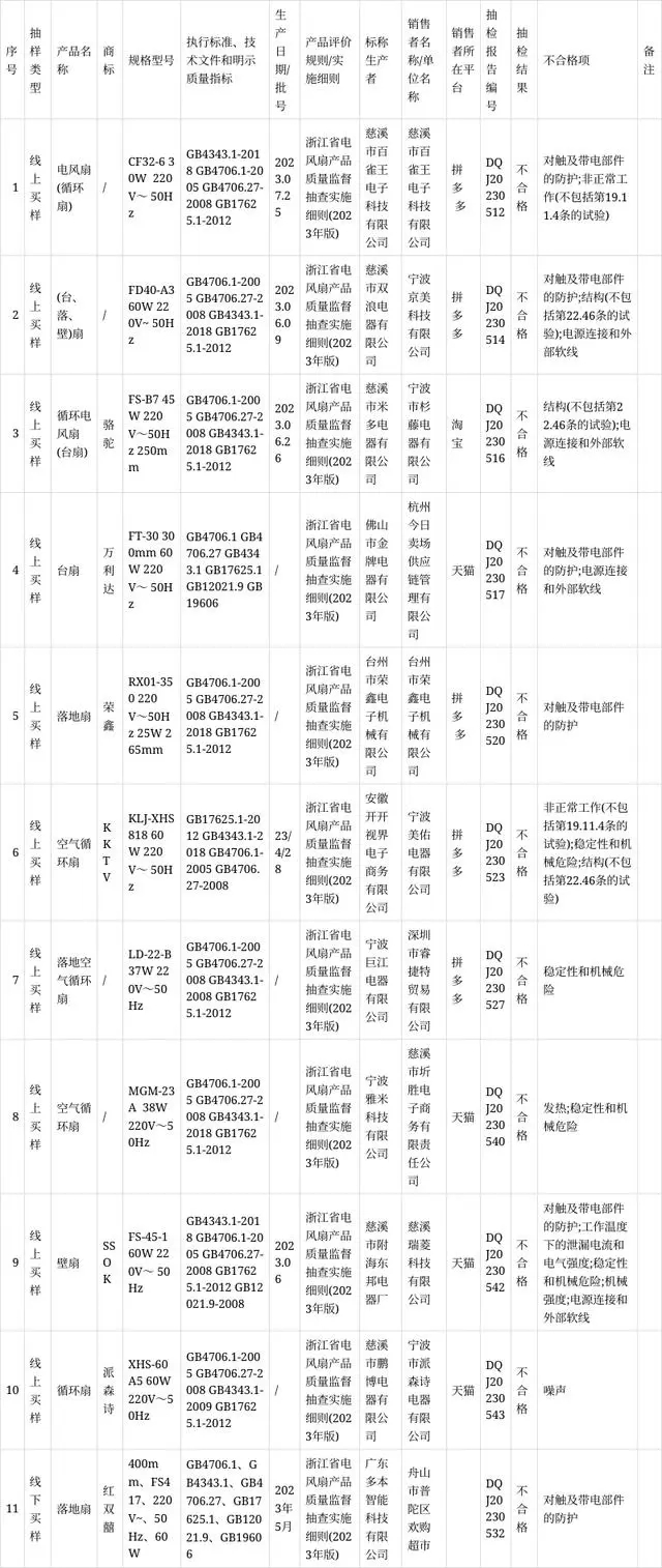 本次抽查了40批次電風(fēng)扇產(chǎn)品,其中11批次產(chǎn)品不合格。不合格項(xiàng)目為對觸及帶電部件的防護(hù)、非正常工作、結(jié)構(gòu)、電源連接和外部軟線、發(fā)熱、穩(wěn)定性和機(jī)械危險(xiǎn)、工作溫度下的泄漏電流和電氣強(qiáng)度、機(jī)械強(qiáng)度、噪聲。