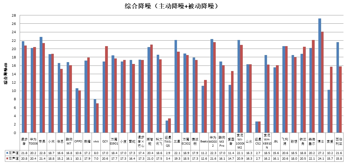 本次綜合降噪測試,指的是主動降噪和被動降噪疊加的總體降噪,也是模擬消費者佩戴耳機在日常的噪聲環境下最直觀的感受。由于參與測試的部分耳機不具備主動降噪功能,所以降噪評價采用綜合降噪(主動降噪+被動降噪),綜合降噪可以更真實地反映消費者最直觀的感受。