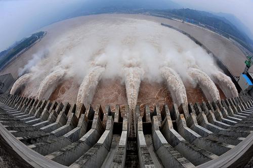 2008年8月13日,長江入汛以來的最大一次洪水順利通過三峽工程向中下游推進,中下游水位持續上漲,三峽工程運行正常。2009年汛期,三峽水庫的防洪庫容已達146億立方米,開始發揮攔洪調峰和枯水期給下游補水的功能,下游荊江河段防洪標準已從十年一遇提高到了近百年一遇,長江中下游的防洪體系初步形成。新華社記者杜華舉攝