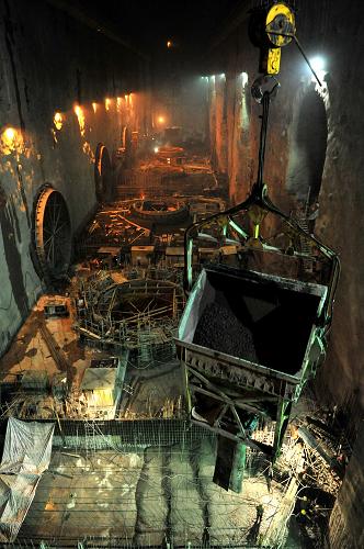 正在建設中的三峽工程地下電站內景(2009年3月26日攝)。目前,三峽工程的樞紐和輸變電工程已基本完工,運行平穩,綜合效益日益顯現。2009年6月30日,三峽電站26臺機組首次實現全部同時并網發電。