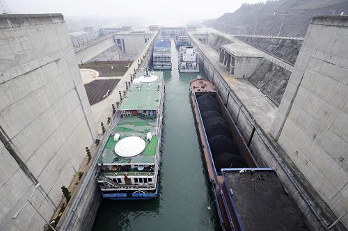 2008年2月23日,船舶在三峽船閘閘室內等待過閘。2009年6月17日,三峽船閘安全穩定通航6年,發揮了巨大的通航效益。截至6月底,三峽船閘累計運行近5萬閘次,過閘貨運量突破3億噸。新華社記者杜華舉攝