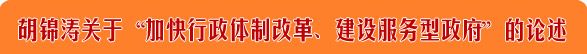 加快行政管理體制改革,建設服務型政府。行政管理體制改革是深化改革的重要環節。 要抓緊制定行政管理體制改革總體方案,著力轉變職能、理順關系、優化結構、提高效能, 形成權責一致、分工合理、決策科學、執行順暢、監督有力的行政管理體制。健全政府職 責體系,完善公共服務體系,推行電子政務,強化社會管理和公共服務。加快推進政企分 開、政資分開、政事分開、政府與市場中介組織分開,規范行政行為,加強行政執法部門 建設,減少和規范行政審批,減少政府對微觀經濟運行的干預。規范垂直管理部門和地方 政府的關系。